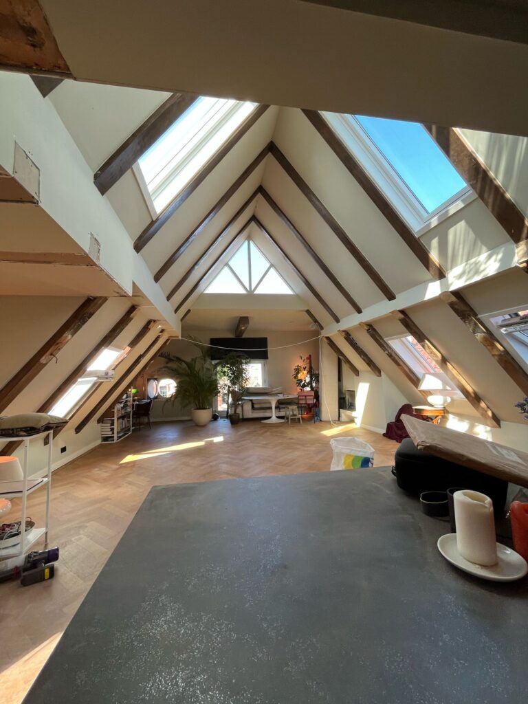 Een donkere zolderruimte getransformeerd tot een lichte en ruime leefruimte met grote dakramen en zichtbare houten balken.