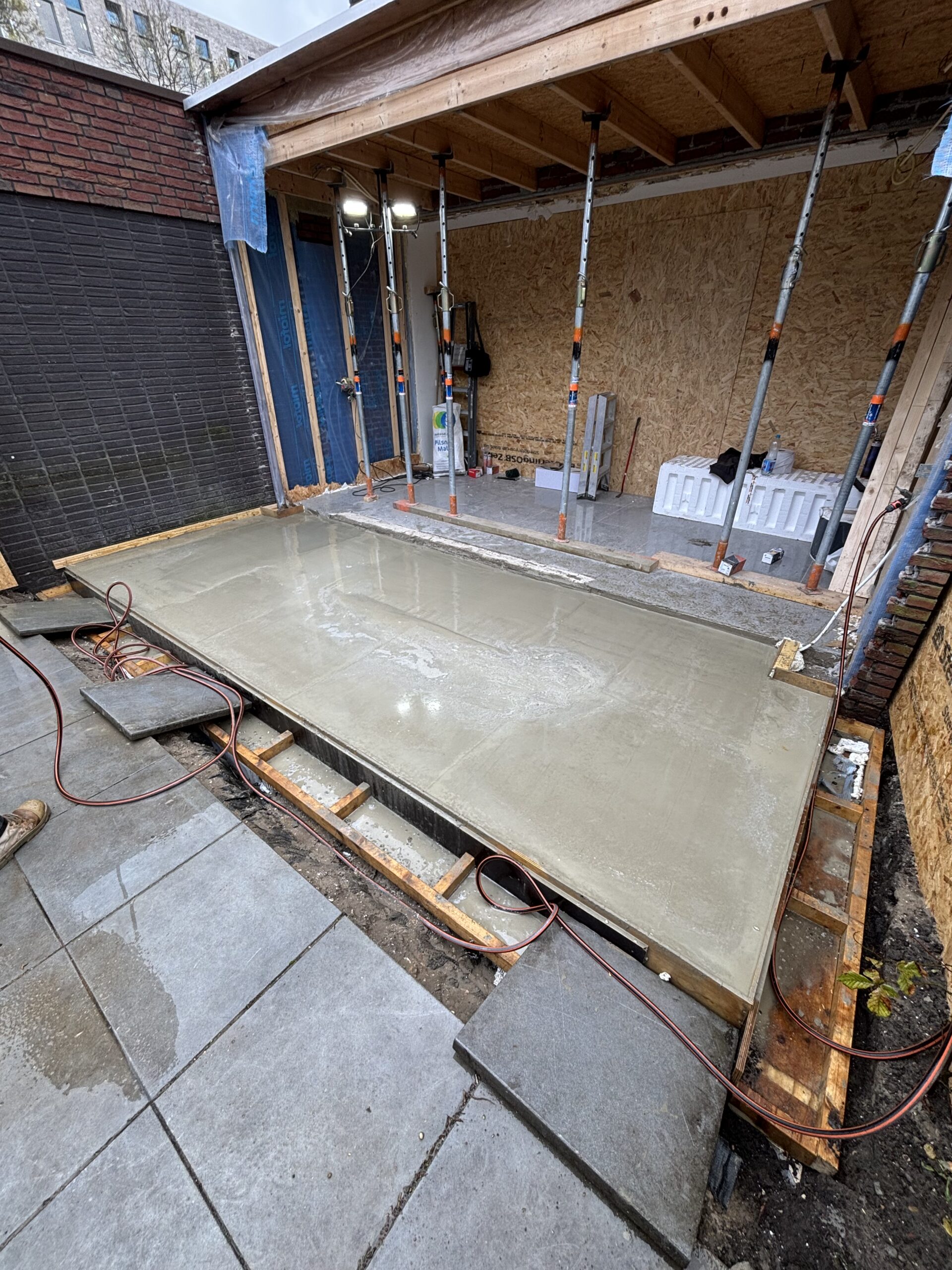 Een bestaande garage volledig omgebouwd tot een geïsoleerde en afgewerkte woonruimte met een nieuwe vloer en nette wandafwerking.